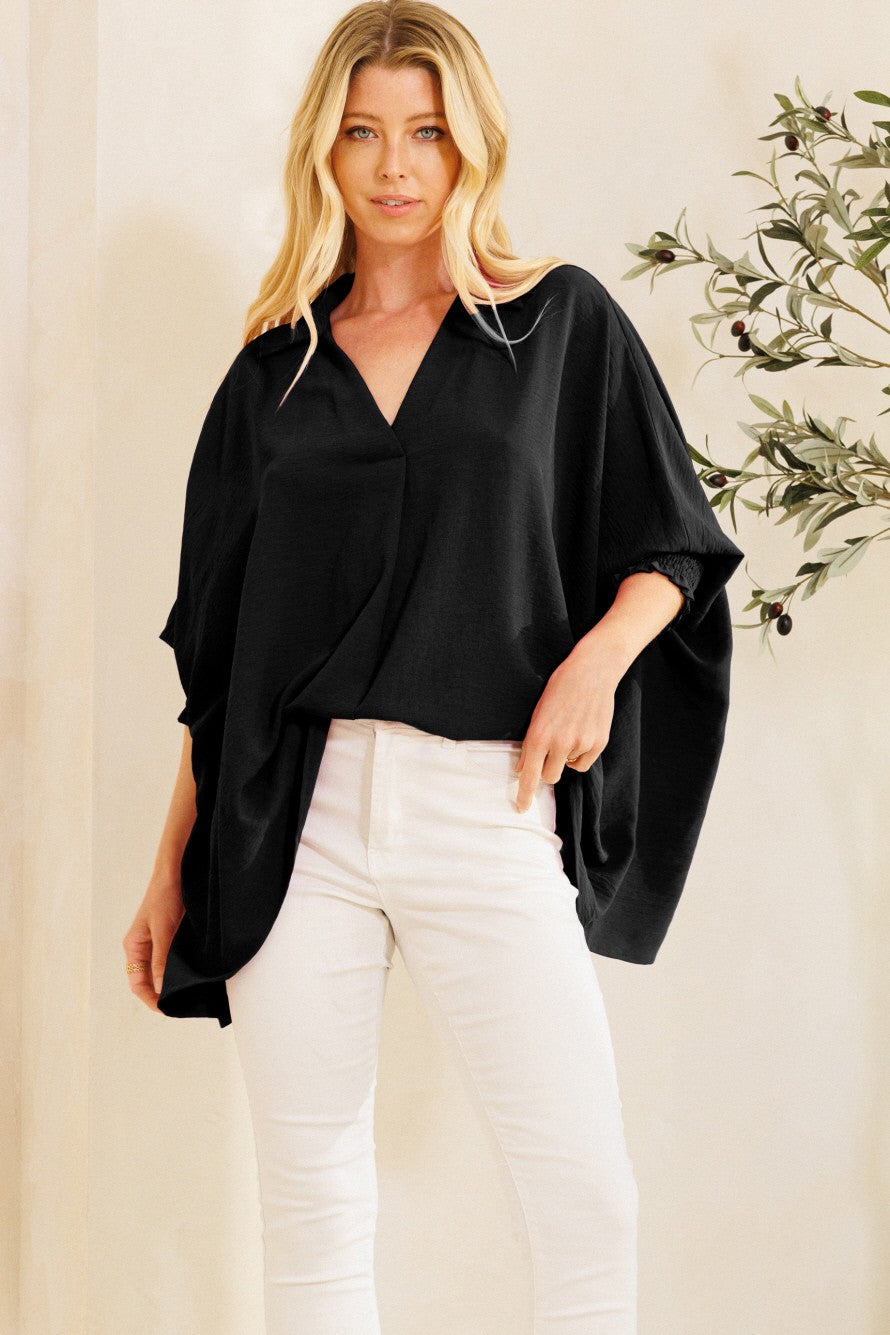 V neckline oversized solid blouse featuring smocked 3/4" sleeve cuffs and spread collar