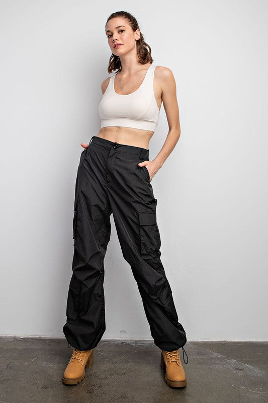 Parachute Cargo Pants – Black. Drawstring - Back Pockets - Side Pockets