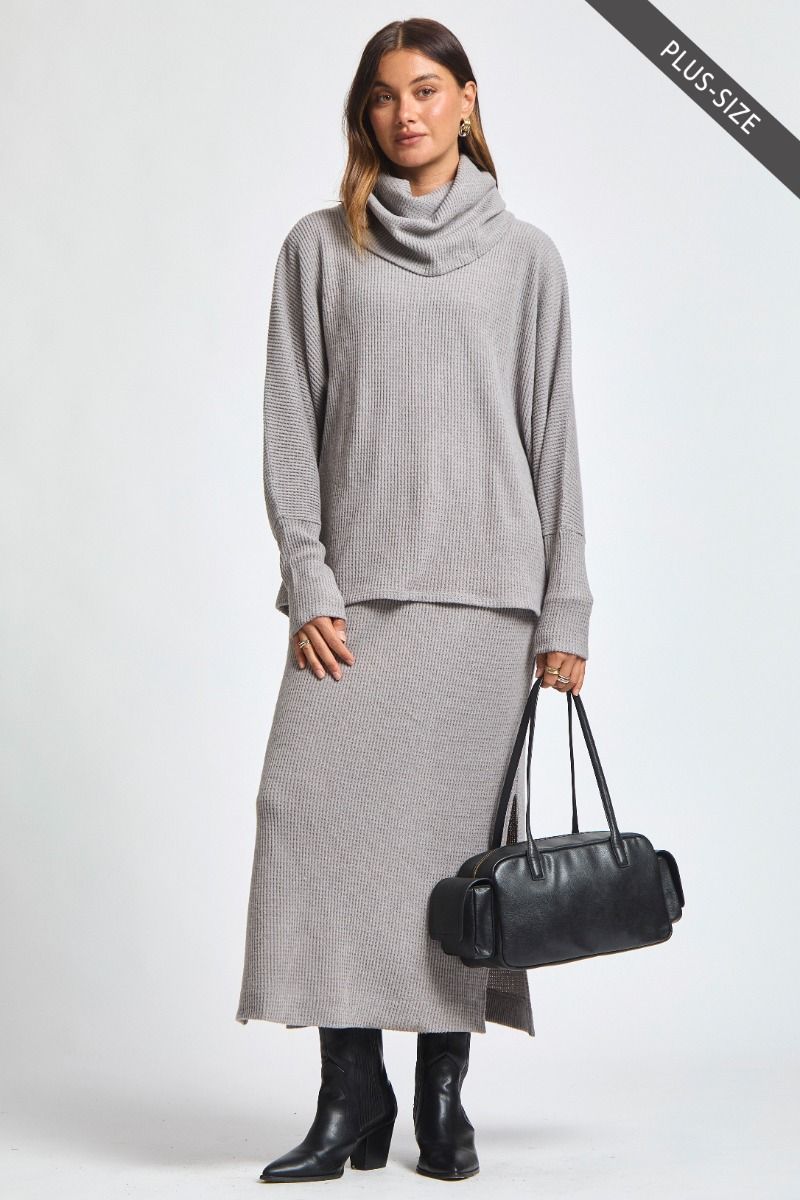 2 piece set, featuring a soft brushed thermal cowl neck sweater layered over a flattering midi dress. The textured thermal fabric adds warmth and comfort, while the cowl neck brings a touch of effortless elegance.